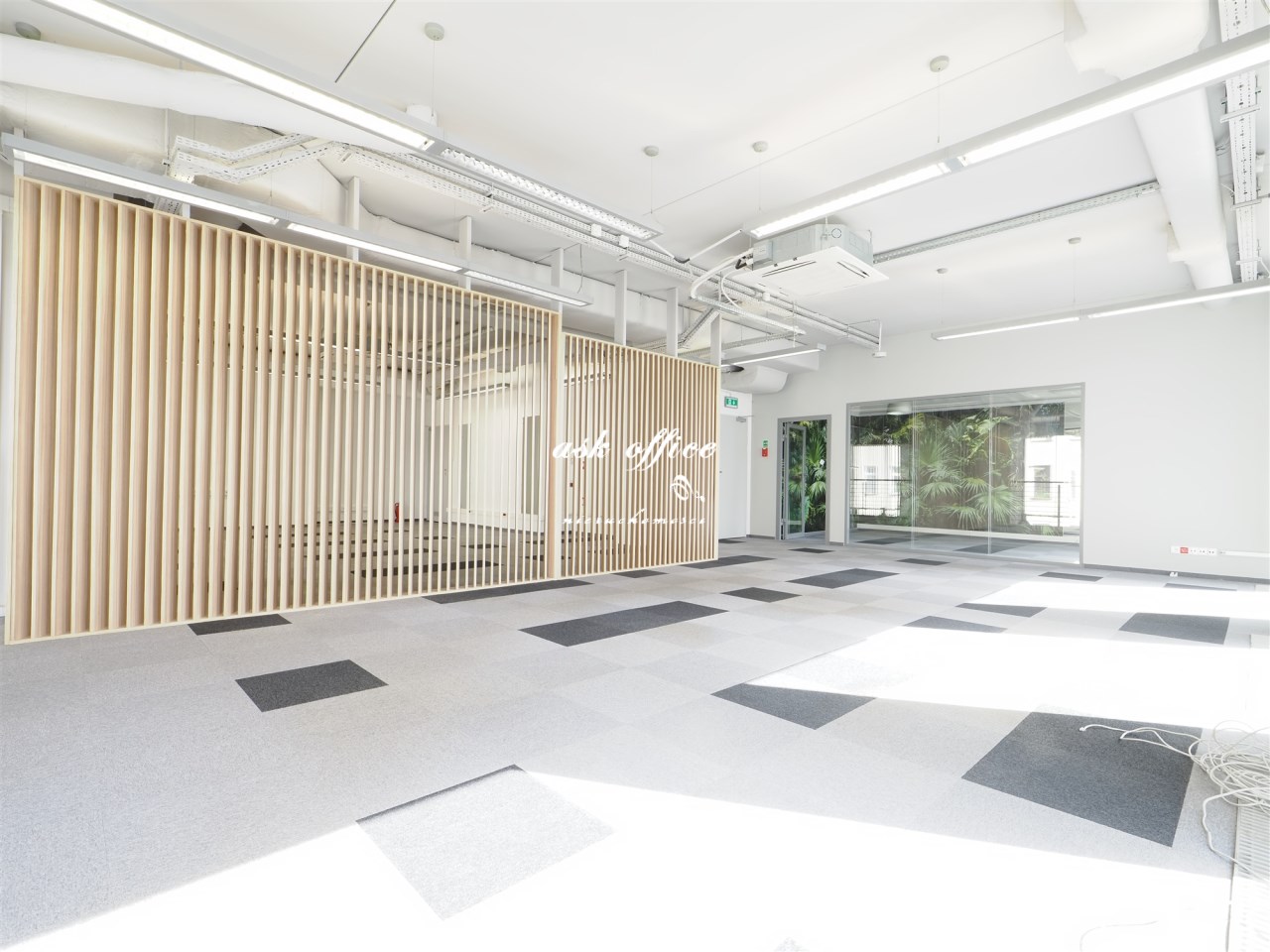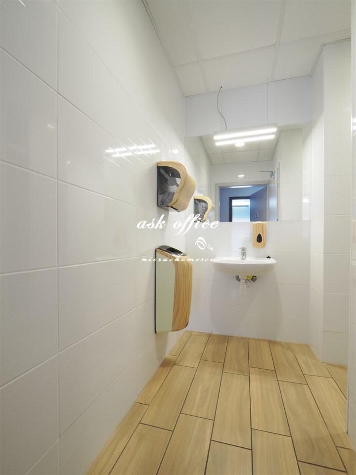 Hol, open space, salki konferencyjne, antresola, kuchnia, łazienka kabiną prysznicową, toalety.