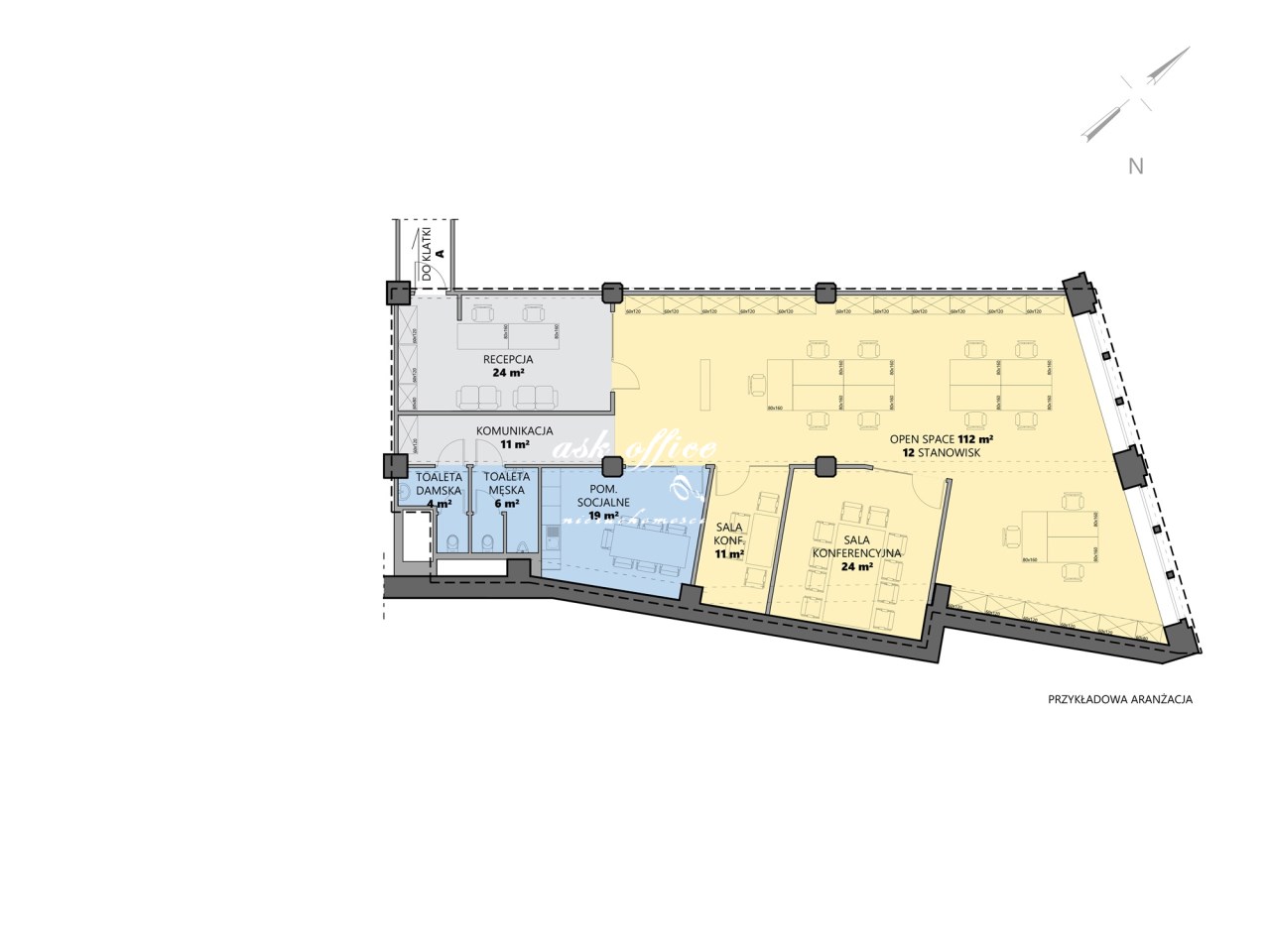 Sekretariat, powierzchnia otwarta , dwie salki konferencyjne ,socjal, toaleta.