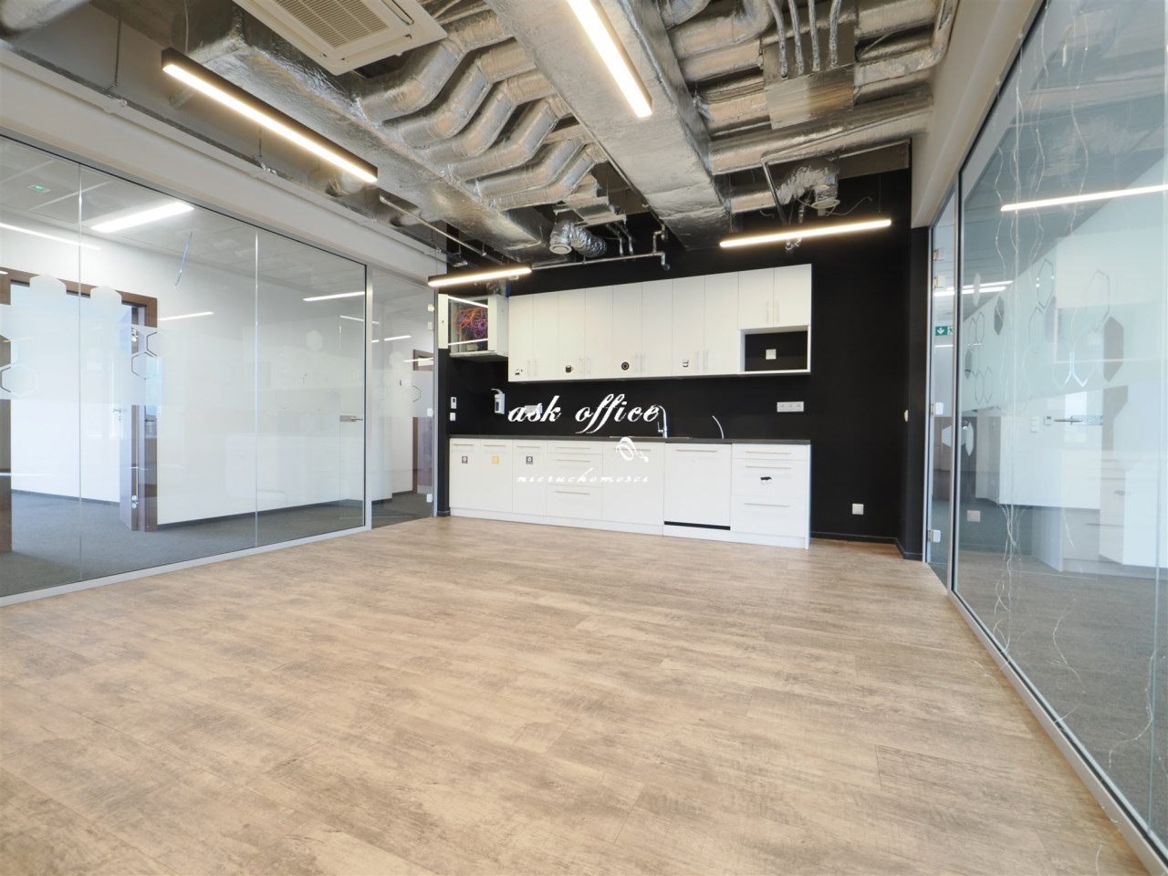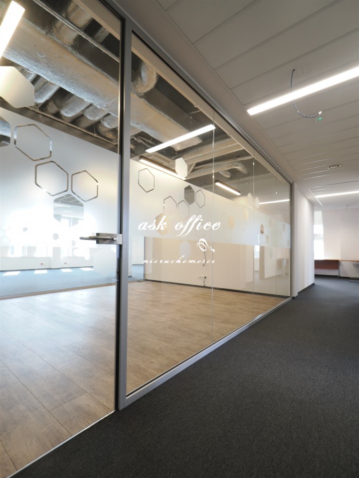 Hol, open space, trzy gabinety, dwie salki rozmów, kuchnia.