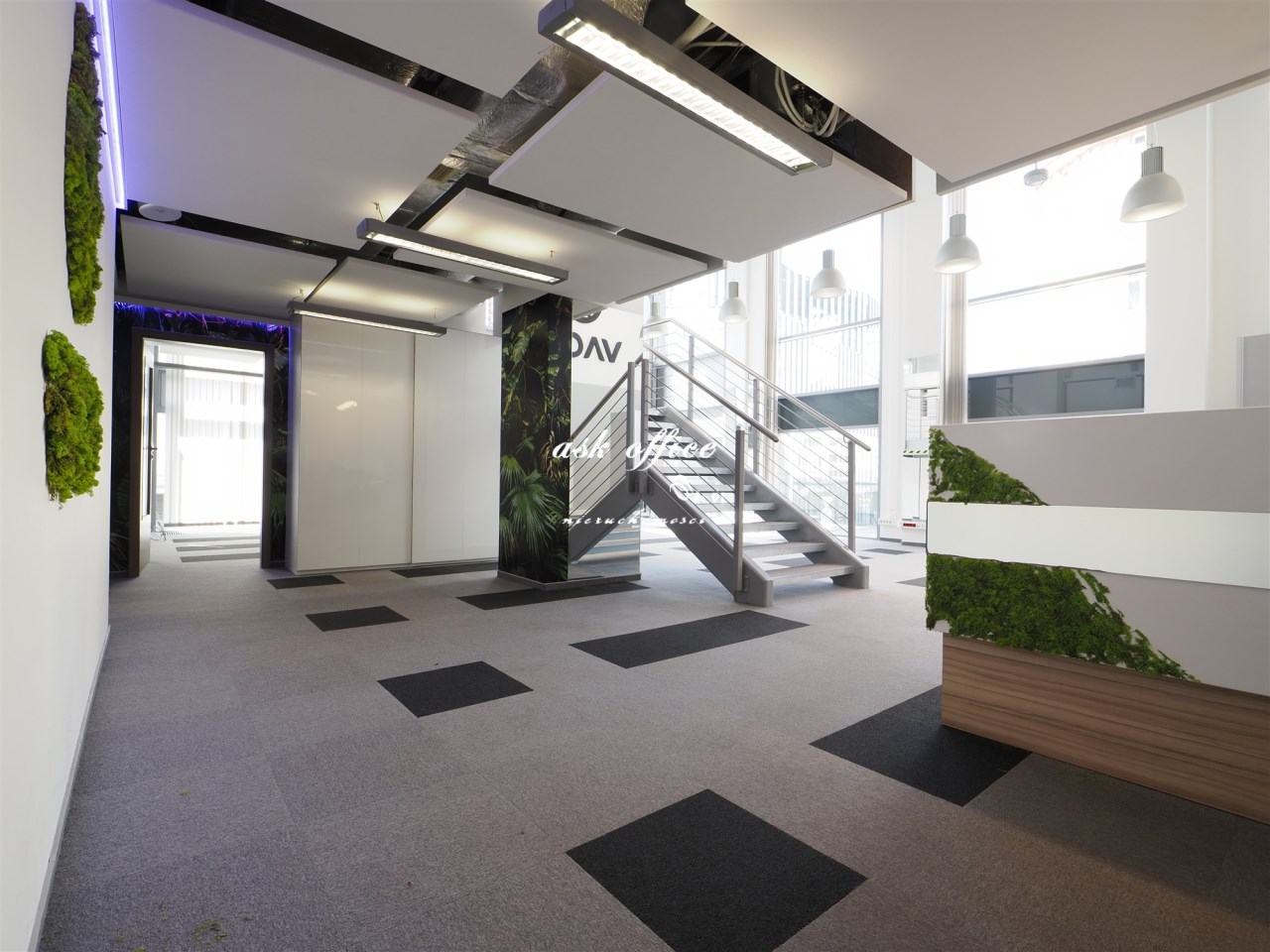 Hol, open space, salki konferencyjne, antresola, kuchnia, łazienka kabiną prysznicową, toalety.