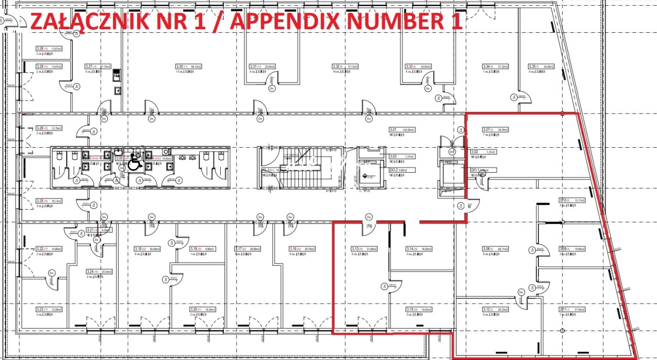 Sekretariat, trzy pokoje, archiwum, salka konferencyjna, magazynek, dwa pokoje przejściowe.
