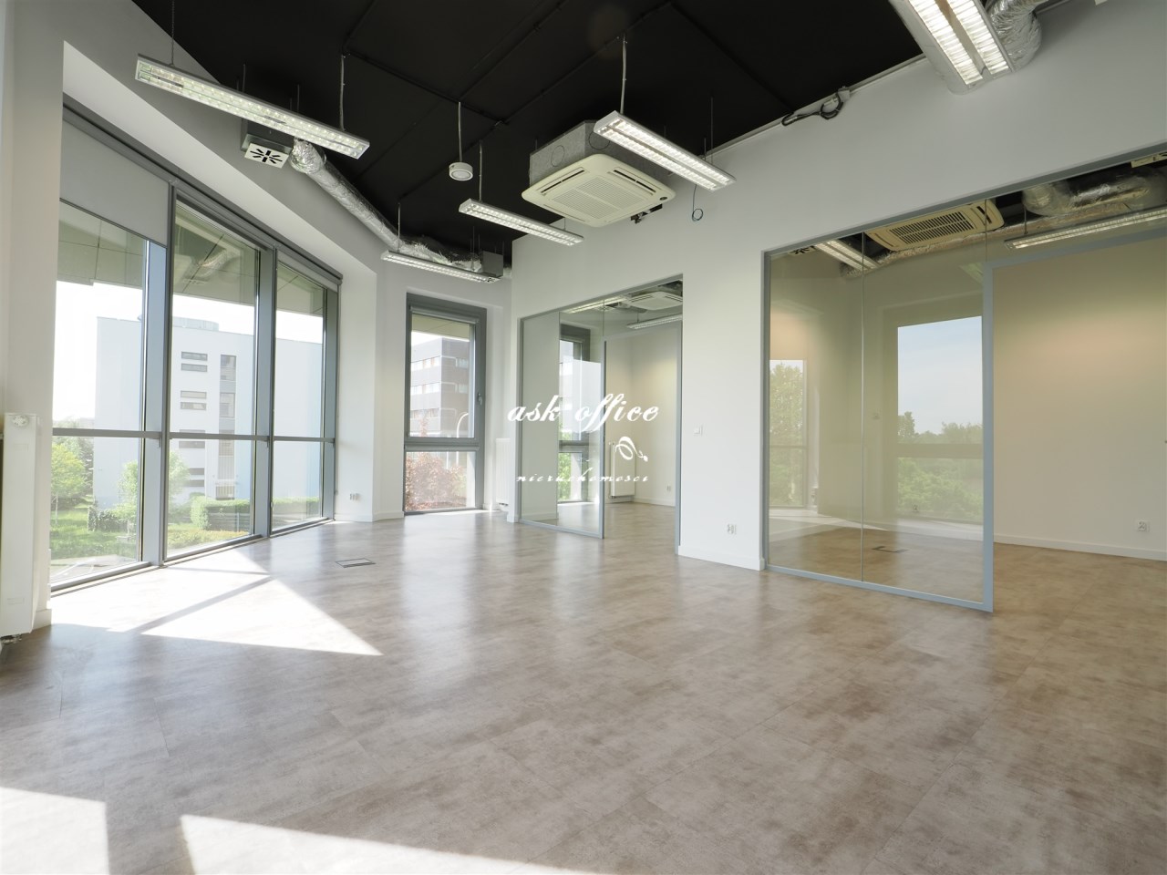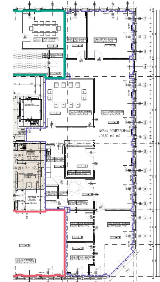 Hol, open space, gabinet, duża salka konferencyjna, pokój, cztery małe salki, kuchnia.