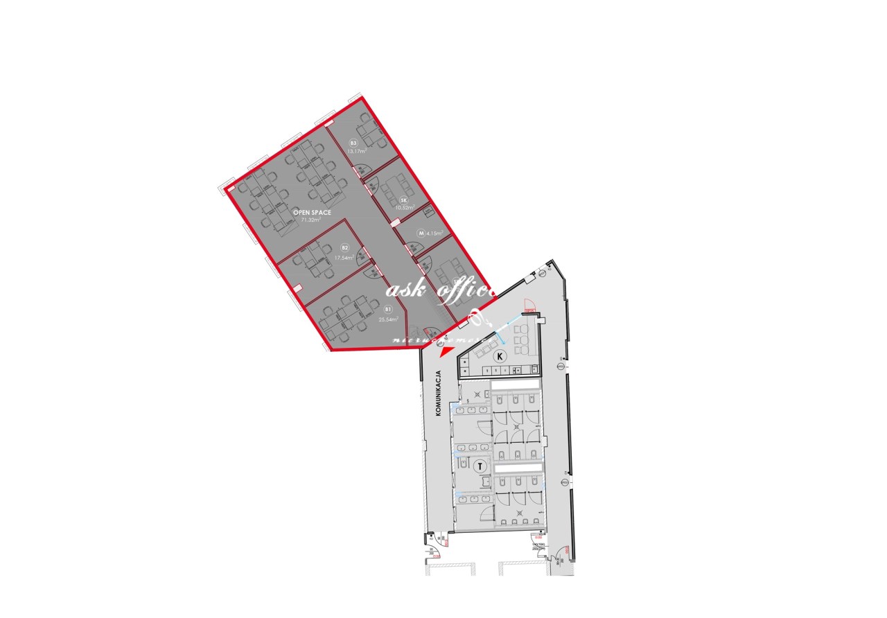 Open space, trzy pokoje, dwie salki konferencyjne, archiwum, serwerownia.