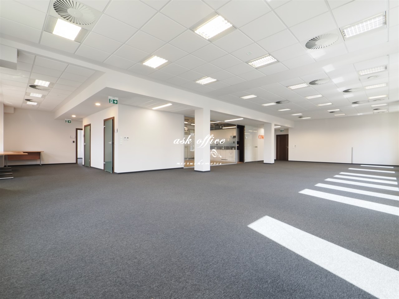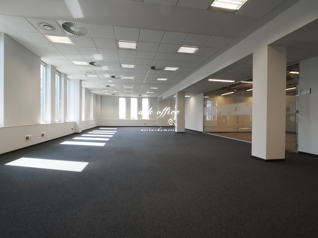 Hol, open space, trzy gabinety, dwie salki rozmów, kuchnia.