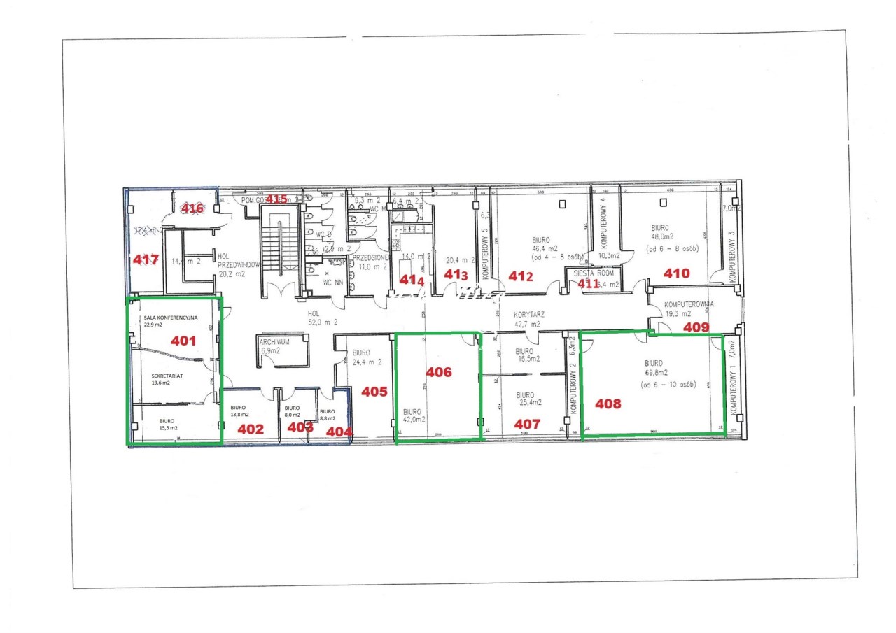Trzy pokoje biurowe połączone drzwiami wewnętrznymi.