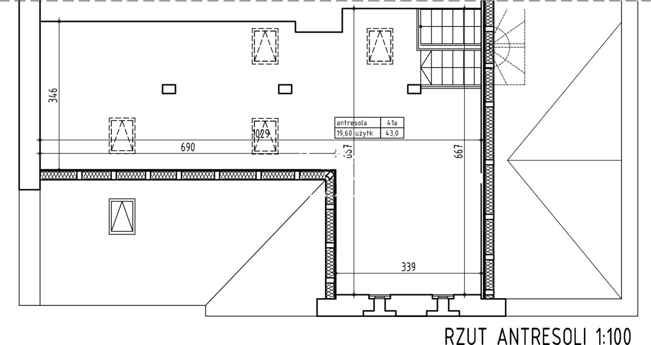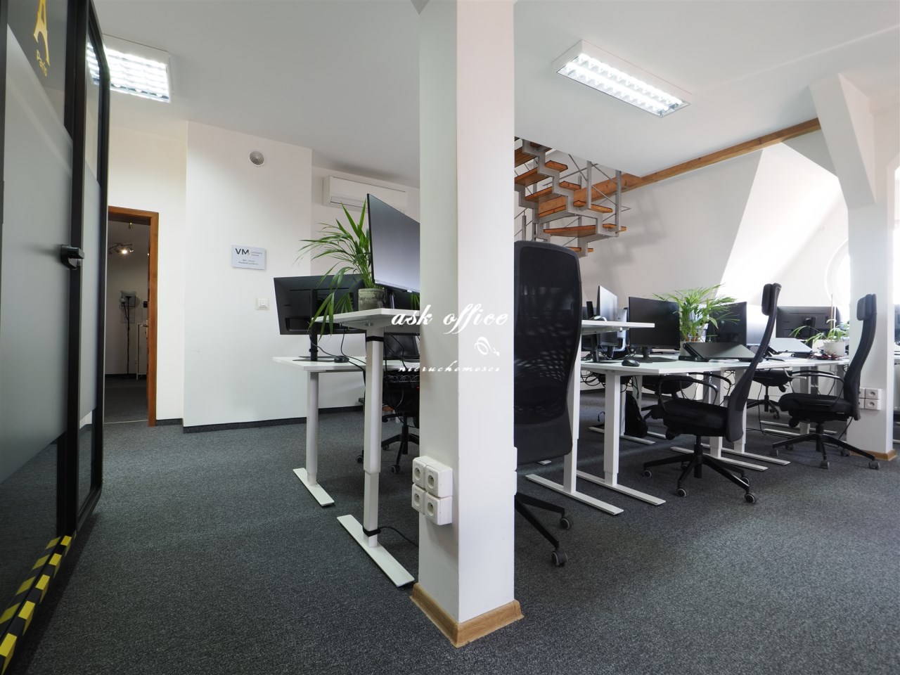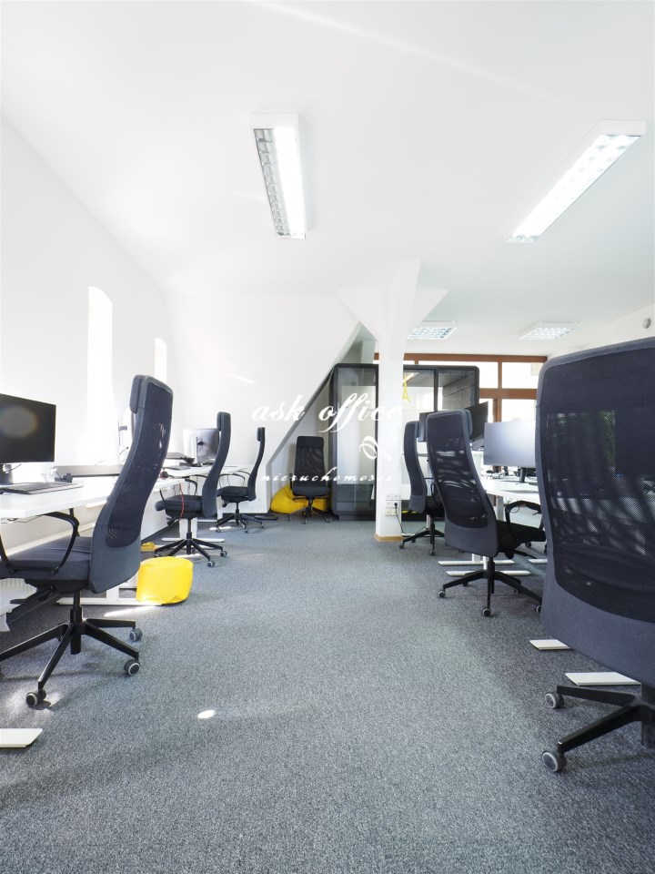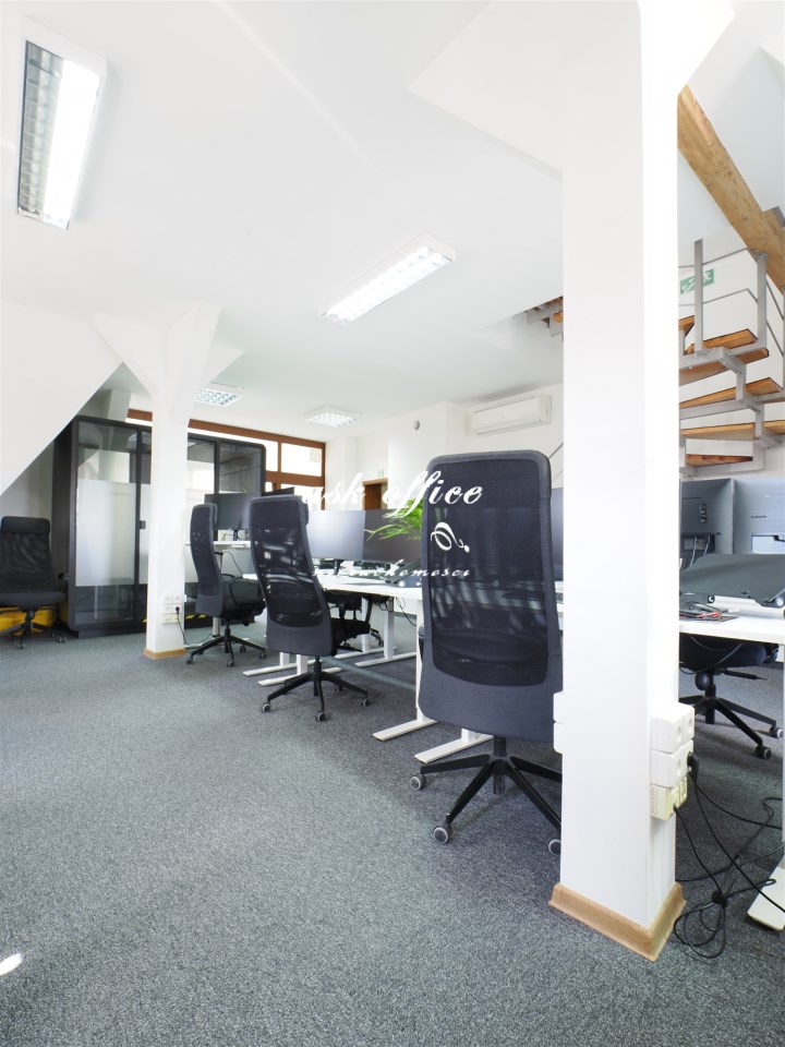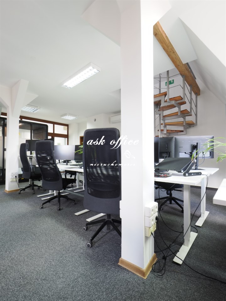 Open space, dwa gabinety, kuchnia, toaleta, antresola.